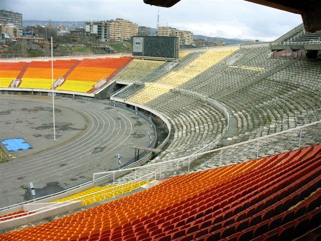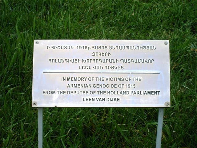 Poghots 10. Dinsdag 10 april 2007Na een rustig vlucht via Wenen ´s ochtends om 5 uur in Yerevan geland. Het is koud en nat. Door een donker en stil Yerevan naar het hotel dat mooi in het centrum van de stad aan het Plein der Republiek ligt. Inchecken en slapen. Daarna loop ik naar Tsitsernakaberd, oftewel het Museum van de Armeense Genocide. Het ligt een kilometer of twee buiten het centrum op de hellingen van de Hrazdan-kloof, waar de gelijknamige rivier door heen stroomt. Het is een leuke wandeling, leuk althans als je van het zooierige houdt dat iedere stad buiten de beschaafde wereld buiten het centrum zo kenmerkt. Het verkeer bestaat uit een mengeling van robuuste 4wheeldrives, oude Lada’s en kreunende, zwaar rokende vrachtwagens, die de helling optuffen waar het nationale voetbalstadion –ook al Hrazdan genaamd- tegen aan is gebouwd. De betonnen bak is in vervallen staat, maar wordt langzaam opgeknapt. Althans zo interpreteer ik het gehamer van een eenzame bouwvakker op een van de tribunes. De houten zitbanken worden vervangen door kleurige plastic kuipjes. Achter het stadion gaat onder een chaotisch dak van golfplaten een uitgebreid labyrintisch steegjespatroon schuil, een heuse bazar, waar alles te koop is. Niet alleen groente, fruit, vis en vlees maar ook kleren, schoenen, CD’s, elektrische apparaten, aardewerk in vele soorten en maten enz. Ik laat de markt achter me en klim langzaam de heuvel op waar het genocide monument als een scherpe naald omhoog steekt. Een gevaarlijk wapen, gericht op de hemel, maar dat zal zeker niet zo bedoeld zijn in dit zo christelijke land. Ik blijk deze monumentaal vormgegeven herdenkingsplek van achteren te naderen over een slechte asfalt weg die plompverloren uitkomt bij een enorm plateau vanwaar een machtig uitzicht is over de stad en de heilige Ararat-berg, die onbereikbaar ver weg ligt op Turks grondgebied. Op het plateau brandt de eeuwige vlam die begeleid wordt door stemmige muziek. Vanaf hier leidt een herinneringslaan naar een affreus bouwwerk waar het museum in is gevestigd. Langs de laan staan bomen geplant en bordjes onthullen de namen van allerlei hoogwaardigheidsbekleders die hier door de Armeense autoriteiten heengebracht zijn om hun medeleven te betuigen. De president van Finland, de Linkse Partij uit Zweden, veel Amerikaanse congresleden en ook… the deputee of the Holland Parliament, Leen van Dijke liet een gedenkteken achter. Het museum zelf is overigens wegens verbouwing gesloten. Dat lijkt hard nodig, want het in bombastische Sovjet-stijl opgetrokken gebouw is er slecht aan toe. Het is in 1967 gebouwd, toen de communistische autoriteiten bezweken onder toenemende druk van de Armenen om een monument te bouwen, nadat in 1965 voor de vijftigste keer de genocide was herdacht, waarbij de Armenen naar het in Sovjet-kringen weinig geliefde wapen van de demonstratie hadden gegrepen.