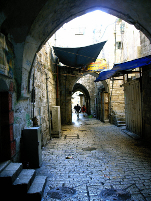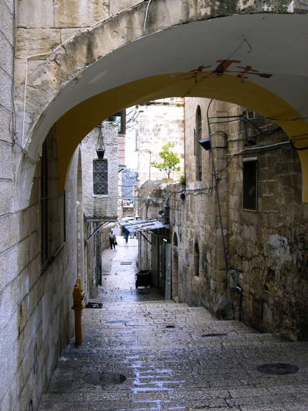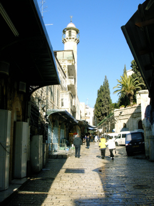 Door de Damascuspoort, de aanbevolen entree van mijn Rough Guide, ga ik het oude Jeruzalem in. Stegen, trappen, maar vooral in dit moslimdeel overal een levendige, uitbundig tentoongestelde straathandel. De zintuigen worden aangenaam op de proef gesteld. De oude binnenstad van Jeruzalem is niet groot, zo ongeveer een kilometer in het vierkant. Met daarin een moslim wijk, een joodse wijk, een christelijke wijk. De moslimwijk is verreweg het levendigst en wordt doorsneden door de Via Dolorosa, waar Jezus zijn kruisweg heeft afgelegd. De twaalf statiën zijn, soms met kapelletjes gemarkeerd en trekken veel pelgrims. Ik kruis een groepje dat een houten kruis mee zeult. De statieweg komt uit bij de Grafkerk, die gebouwd is op de plek waar Jezus gekruisigd, begraven en verrezen is. Geen onbeduidende plek derhalve voor de gelovige christenen die dan ook in grote getale vol devotie neerknielen, bidden en voluit de digitale camera hanteren. Vanaf hier zwerf ik verder langs Grieks-orthodoxe souvenirwinkels, christelijk-Arabische scouting, een koptisch kerkje, een Armeens klooster, moskeeën en synagogen naar de klaagmuur. De enige keer dat ik in de oude stad door een detectiepoort moet. De klaagmuur is in tweeën verdeeld: mannen en vrouwen worden gescheiden door een hek waarbij de vrouwen overigens minder strekkende meters tot hun beschikking hebben. Er wordt fanatiek gebeden, vaak gepaard gaand met heftige lichamelijke schokken. De klaagmuur is in feite onderdeel van al-Haram al-Sharif (voor joden: de Tempelberg), na Mekka en Medina de heiligste plek van de moslims. Deze plek is de grootste open ruimte in de oude stad. Vele poorten leiden vanuit de aangrenzende moslimwijk hier naar toe. Maar voor niet-moslims is er slechts een ingang, pal naast de klaagmuur. Op een bord waarschuwt de rabbijn van Jeruzalem dar joodse gelovigen hier niet naar binnen mogen. Jeruzalem stad van drie belangrijke wereldreligies, die elkaar –en de rest van de wereld- zo veel ellende hebben bezorgd. Op een vierkante kilometer liggen hun grootste heiligdommen ogenschijnlijk zorgeloos door elkaar en krioelen joden, moslims, christenen en ongelovigen daar tussen door. Donderdag