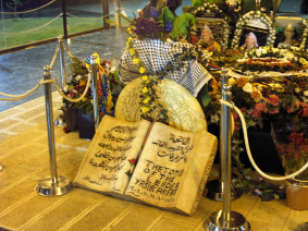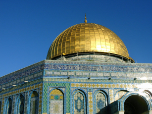 6 januari 2005 De zon schijnt. Eerst de oude stad in om uitgebreider dan gisteren de Tempelberg te kunnen zien. En vast te leggen, want die gouden koepel van de Qubat al-Sakhra moskee blinkt vervaarlijk in de zonneschijn. Ik dwaal rond over het grote terrein: fonteinen, bogen, het islamitisch museum, dat gesloten is, en de beide moskeeën, die alleen voor de ware gelovigen te bezoeken zijn. Maar ook de buitenkant van de Qubat al-Sakhra moskee mag er zijn, rijk versierd met blauwe tegels en boute teksten.