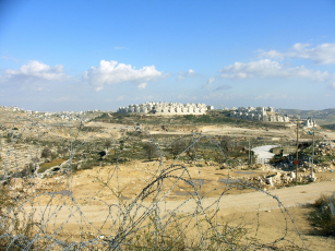 Quabat al-Sakhra moskee Nederzettingen rond Bethlehem Daarna met de minibus naar Bethlehem, dat zo’n acht kilometer ten zuiden van Jerusalem ligt. Maar het is Palestijns gebied. Israël heeft het vorig zwaar te pakken genomen. De stad is omringd door een ijzeren hek, een checkpoint maakt autoverkeer praktisch onmogelijk en in snel tempo wordt Bethlehem met forse flatblokken door Israëlische kolonisten omsingeld. De bus zet me dan ook voor het checkpoint af. Detectiepoortje door, paspoort laten zien en doorlopen. Na een paar honderd meter staan vele taxichauffeurs me op te wachten die je bijna voor niks -er is nauwelijks klandizie- naar de geboorteplek van Jezus willen brengen. Ik heb een onverklaarbare afkeer van taxi’s, maar nu zwicht ik. De chauffeur rijdt naar de geboortekerk, maar biedt me eerst in de souvenirwinkel van zijn broer een kop thee aan. Zijn broer probeert me souvenirs aan te smeren, wat hem ondanks zijn aanhoudende aanprijzingen niet lukt. Daarna ga ik de kerk in. Het is er vol met Grieks-orthodoxen, die bij elke Jezus-plek een forse vinger in de pap hebben. Het is Driekoningen, zodat er ook wat processies van zwaar bebaarde priesters gaande zijn. Voor de ingang die afdaalt naar de grot waar het dan allemaal gebeurd zou zijn, is het een drukte van belang. Groepen pelgrims dringen naar voren en krijgen voorrang. De ordebewaker kijkt verbaasd als ik uitroep dat we allemaal gelijk zijn en ik in m’n eentje een groep vorm. Hij laat me er meteen door. Ik daal een trap af naar een kleine ruimte, waar op de grond onder een altaar een ronde schaal de plek siert. Ervoor staat een dikke zwartjurk die ieder maant snel te knielen en door te lopen. Pelgrims werpen zich in extase languit. ‘s Avonds is er een buffet in de residentie van de Nederlandse vertegenwoordiger bij de Palestijnse Autoriteit, Frans Potuijt voor de Nederlandse kolonie. Een ommuurde villa in een buitenwijk van Oost-Jeruzalem. Waarnemers, diplomaten en journalisten, bij elkaar zo’n mens of twintig, maken het elkaar genoeglijk. Vrijdag