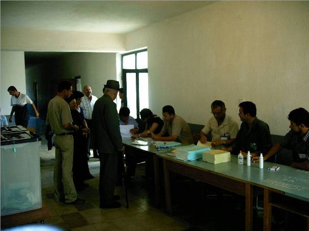 3 juli Om half zes gaat de mobiele wekker. Een half uur voor de opening van de stemlokalen, 7 uur, moeten we aanwezig zijn om de verrichtingen van het stembureau gade te slaan. Zo'n stembureau bestaat maar liefst uit acht leden, zorgvuldig verspreid over de diverse partijen. Ons kiesdistrict nr. 90 bestaat uit vijftig stemlokalen. We besluiten naar Lazarat te gaan. Zo op het oog een dorp van niks met drie stemlokalen, maar met een beruchte reputatie. Het zuiden van Albaniė is een bolwerk van de SP, wat zijn oorsprong heeft in de Tweede Wereldoorlog. De linkse partizanen voerde een guerrilla tegen de Duitsers, maar Lazarat was als een zwart schaap op de hand van de bezetter. Na de oorlog is het nooit meer goed gekomen tussen Lazarat en zijn wijde omgeving. Om zich te handhaven bleven de bewoners bij elkaar klitten, trokken niet weg, en trouwden in het dorp, dat nu -uiteraard- een bolwerk van de rechtse DP is. De reputatie kreeg bij de vorige parlementsverkiezingen een nieuwe impuls, omdat er een opkomst van 95% werd genoteerd, met een overweldigende meerderheid voor de DP. En daarmee werd het voor velen de icoon van de fraude die Albanese verkiezingen pleegt te teisteren. En dus zijn we om half zeven present in een stemlokaal in een schooltje, midden in het dorp. De acht leden van het stembureau beginnen net met hun voorbereidingen. De stemformulieren gaan uit het plastic, de twee doorzichtige stembussen die leeg zijn- worden verzegeld, de kiezerslijst wordt klaargelegd, evenals de flacons onzichtbare inkt die op iedere duim gespoten wordt ten teken dat de betreffende man of vrouw heeft gestemd. Zo wil men voorkomen dat mensen twee keer gaan stemmen. Daartoe moet natuurlijk dan ook iedere duim voor het inkten bekeken worden met een infrarode lamp, die de onzichtbare inkt traceert. De acht stembureauleden zijn wat zenuwachtig met ons onverwachte bezoek, maar slagen erin in een half uur alle formaliteiten te regelen. Vanaf zeven uur druppelen de eerste kiezers het kleine, kale schoollokaaltje binnen. Anders dan in Neerland moet men zich identificeren, achter de naam op de kiezerslijst wordt het nummer van het identiteitsbewijs opgeschreven en zet de gelukkige kiezer zijn handtekening, waarna de duimenprocedure plaatsvindt. Vervolgens krijgt zij twee stembiljetten uitgereikt die inmiddels door een stembureaulid van stempels is voorzien. De kiezer gaat naar uit een karton opgetrokken stemhokje, zet een van de twee toegestane symbolen - + of x - achter de naam van de kandidaat en de partij en gooit ieder formulier in een aparte stembus, die door een stembureaulid nauwlettend wordt bewaakt.